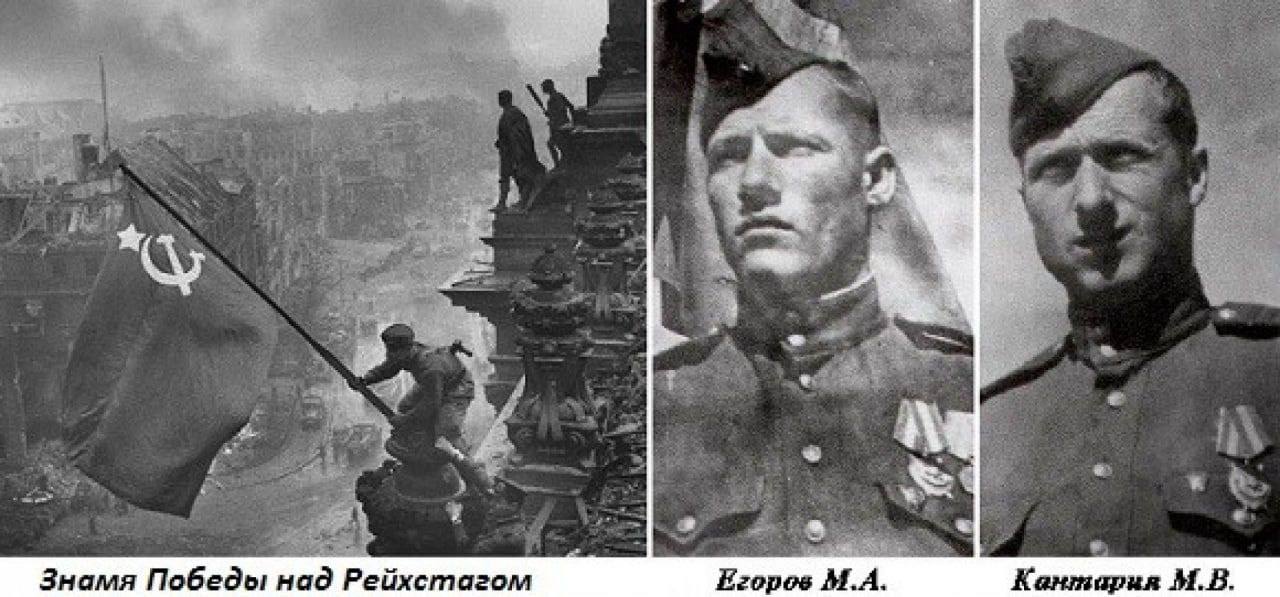 Первыми — в 22 часа 30 минут по московскому времени 30 апреля 1945 г. водрузили штурмовое красное знамя на крыше рейхстага на скульптурной фигуре «Богиня победы»